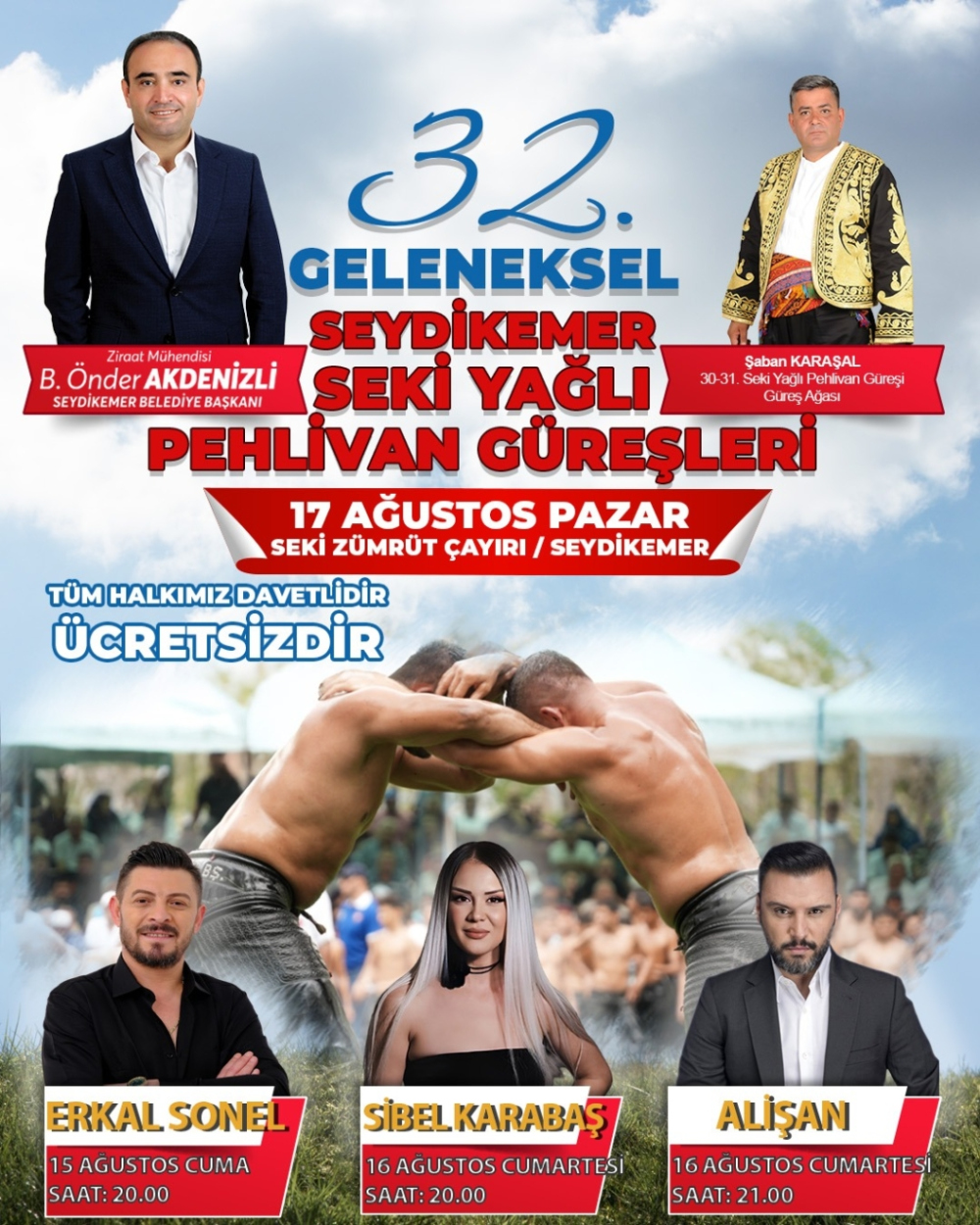 Seydikemer Belediye Başkanı B. Önder Akdenizli, 15-16 Ağustos tarihleri arasında düzenlenecek olan halk konserleri ve 17 Ağustos Pazar günü gerçekleşecek 32. Seydikemer Seki Yağlı Pehlivan Güreşleri’ne tüm vatandaşları davet etti.